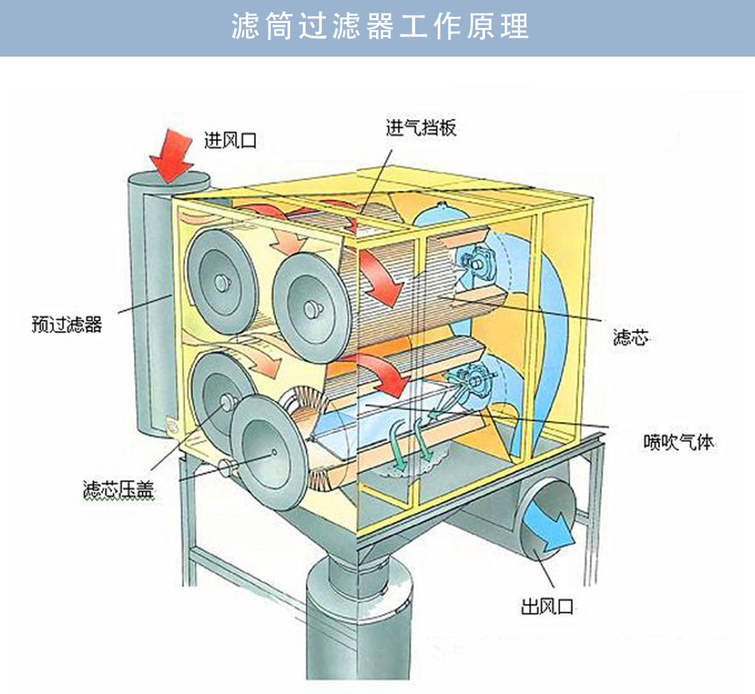 側(cè)裝卡盤式濾筒除塵器顧名思義也是濾筒除塵器的一種只是內(nèi)部過濾元件安裝方式不同,其工作原理相同:在空氣過濾過程中,由于塵埃的吸附使流經(jīng)高效濾芯的空氣流的內(nèi)外壓差會逐步增大,當(dāng)經(jīng)過除塵器的內(nèi)部濾筒時的內(nèi)外壓差大于某一整定值時,“脈沖控制器”即自動啟動,它控制“脈沖閥”在極短的時間內(nèi)用壓縮空氣向每排濾芯進(jìn)行由里向外有程序的脈沖式反沖洗 ,以清除吸附于濾芯上的積塵;當(dāng)濾芯沖洗干凈時(即內(nèi)外壓差小于某一設(shè)定值或反沖洗經(jīng)過若干次循環(huán)后),沖洗過程及自行停止。由于反沖洗的壓縮空氣是通過“文丘里管”向濾芯引射,所以不僅耗氣量極少,而且爆發(fā)力強(qiáng),沖洗效果好。脈沖清洗時基本不影響用氣設(shè)備的正常運行。