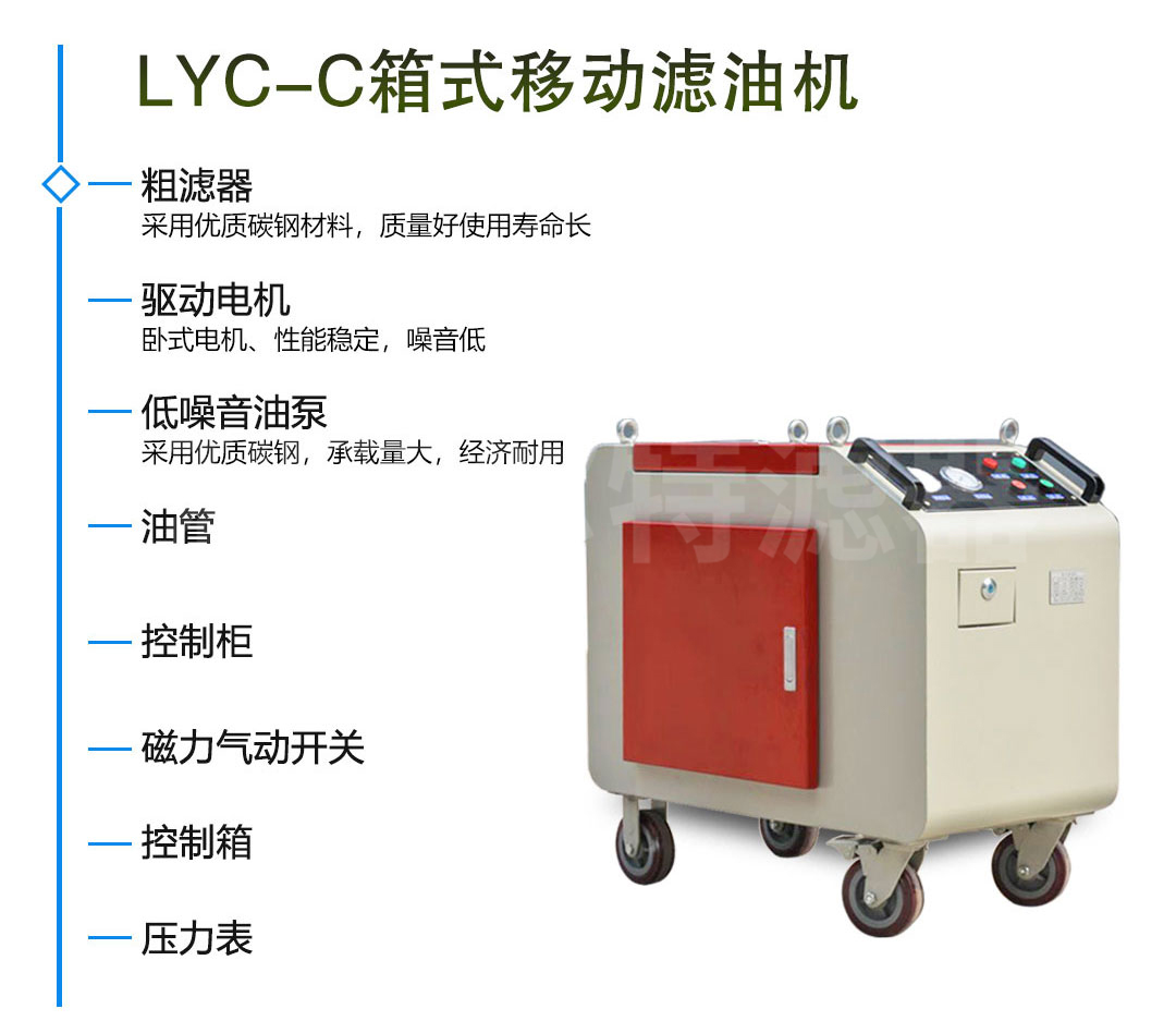 FLYC-63C-三級(jí)過(guò)濾防爆箱式移動(dòng)濾油機(jī)屬于箱式移動(dòng)濾油機(jī)系列,和其他箱式濾油機(jī)不同,箱型濾油機(jī)可以根據(jù)客戶(hù)需要選擇不同體積的濾油機(jī),作為油液盛放工具,方便油液過(guò)濾。